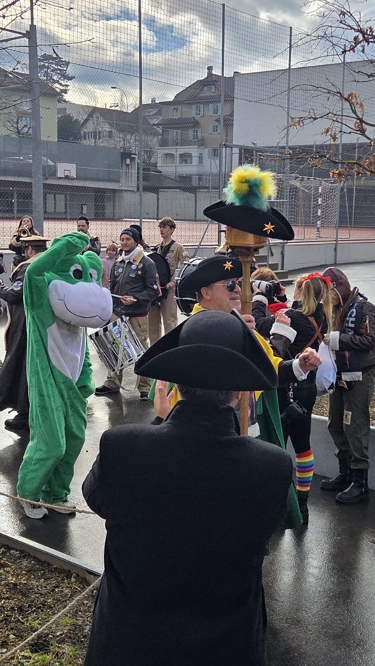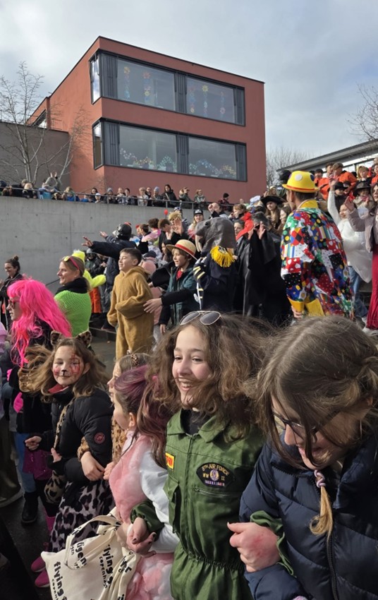 Am Nachmittag wurde der Fachnachtstag mit einem besonderen Highlight abgerundet: DieGuggenmusik Cocoschüttler, Glögglifrösch sowie die Fröschezunft besuchten unsere Schule draussen auf der grossen Treppe und begeisterten die Kinder mit ihrer Musik und ihrem Auftritt. So sehr, dass mehrmals nach einer Zugabe gefordert wurde! Insgesamt war es ein fröhlicher, lebendiger Tag voller Lachen, Bewegung und gemeinsamer Erlebnisse. Wir bedanken uns bei allen engagierten Lehrpersonen und natürlich bei der Fröschezunft und Guggenmusiker, welche sich für diesen Anlass extra frei genommen haben.