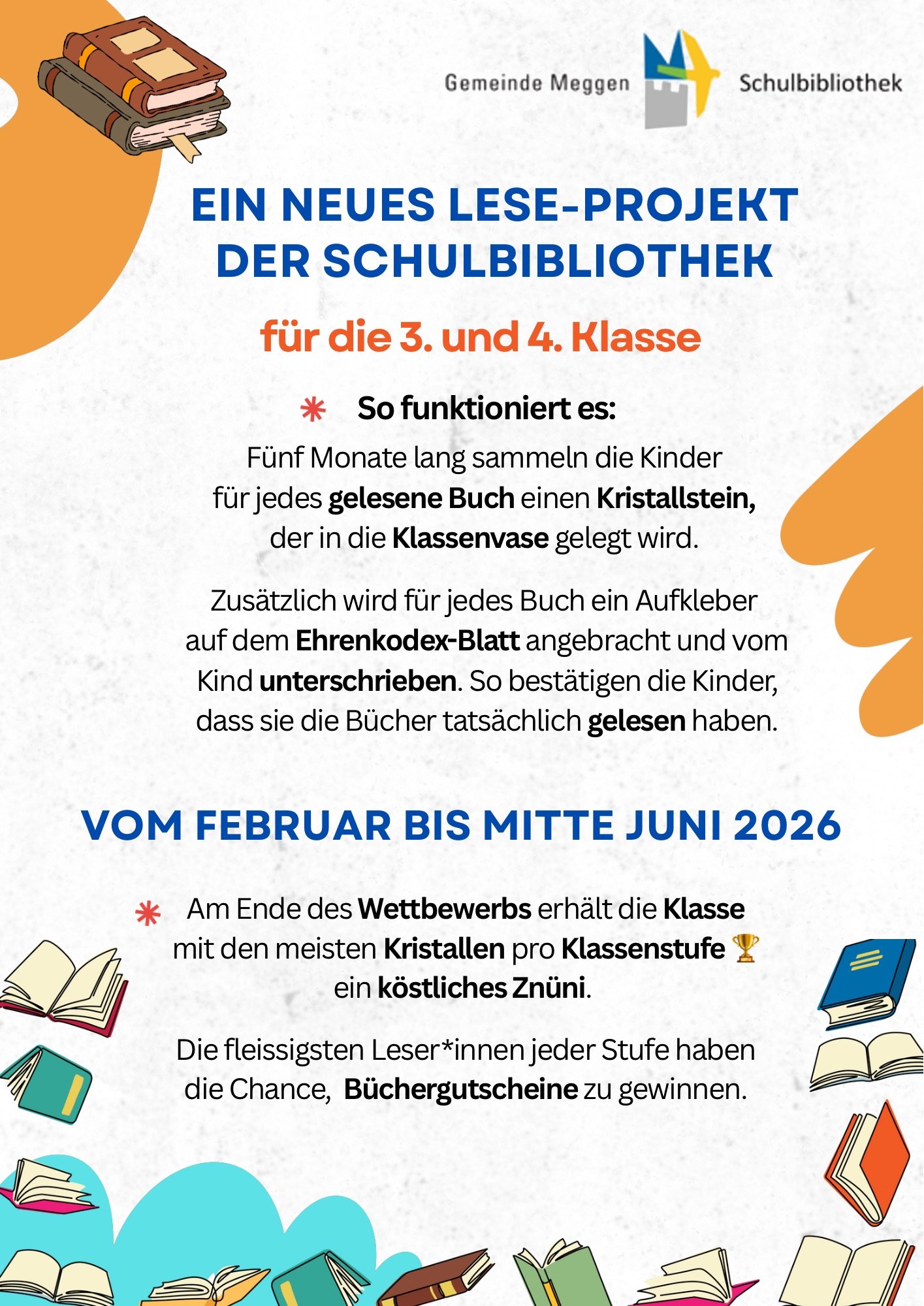 Fünf Monate lang widmen sich die Dritt- und Viertklässler dem Lesen. Für jedes gelesene Buch legen wir einen Kristallstein in die Klassenvase und kleben einen Aufkleber mit ihrem Namen auf das Ehrenkodex-Blatt.